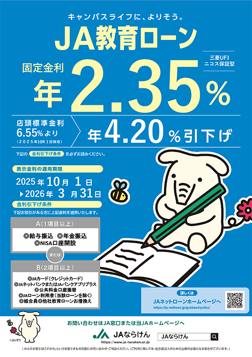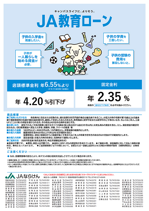 - お客様の事情によりましては奈良県信用基金協会保証型の教育ローンのご提案をさせていただく場合もございます。