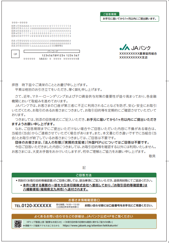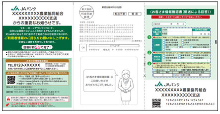 つきましては、当JAより「お届け内容のご確認のお願い」または、「事業内容・お取引目的等のご確認のお願い」を受領されたお客様には大変お手数をおかけいたしますが、ご案内の回答期限までに往復ハガキまたは封書にてご返送いただきますようお願いいたします。